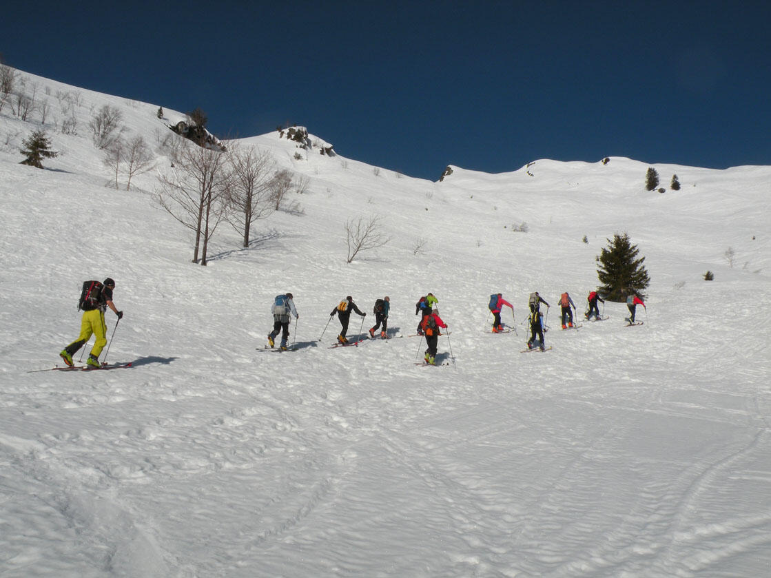 Virginie Arrivée sous le soleil, sans vent, même pas froid !!! On aurait dû monter les pic-niques... La descente va être inégale : des plaques de neige dure, transformée par le vent, alternent avec des zones de neige plus profonde, souvent finement croûtée. La vig -